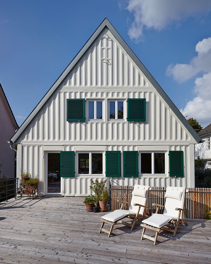 Als angenehmer Nebeneffekt entstand oberhalb des Büros eine großzügige Dachterrasse, die vom Wohnzimmer aus schwellenlos zu betreten ist.