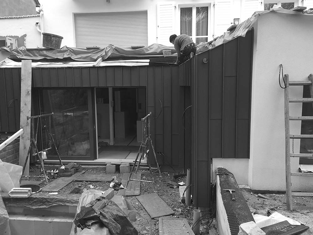 Die zum Tiefhof hin orientierte Fassade wurde als gegliederte Metallfassade aus vorbewittertem Zinkblech gekantet.