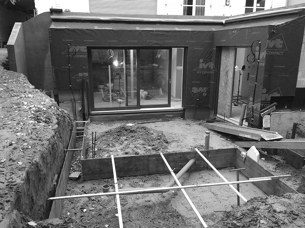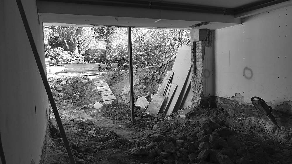Die Aufgabe war, die niedrigen Kellerräume zum Aufenthalt und Wellness umzubauen und den Garten wahrnehmbarer an das Souterrain anzubinden. Hierzu wurden der Grundriss großzügiger organisiert, die Fassade geöffnet und die Räume durch Erweiterung nach außen vergrößert. Zur Schaffung einer angemessenen Raumhöhe wurde die Bodenplatte mittels aufwendiger Unterfangungsmaßnahmen tiefer gelegt und der Bodenaufbau inklusive Dämmung und Fußbodenheizung neu aufgebaut.